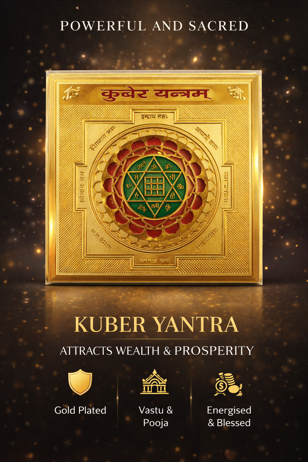 The Kubera Yantra (Kuber Yantram) is a sacred Vedic symbol dedicated to Lord Kuber, the god of wealth and prosperity. This beautifully crafted gold-plated yantra is designed according to traditional scriptures and is ideal for attracting financial abundance, success in business, removal of money blockages, and positive energy.